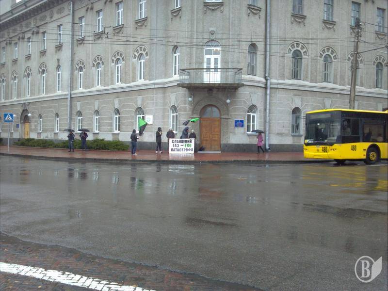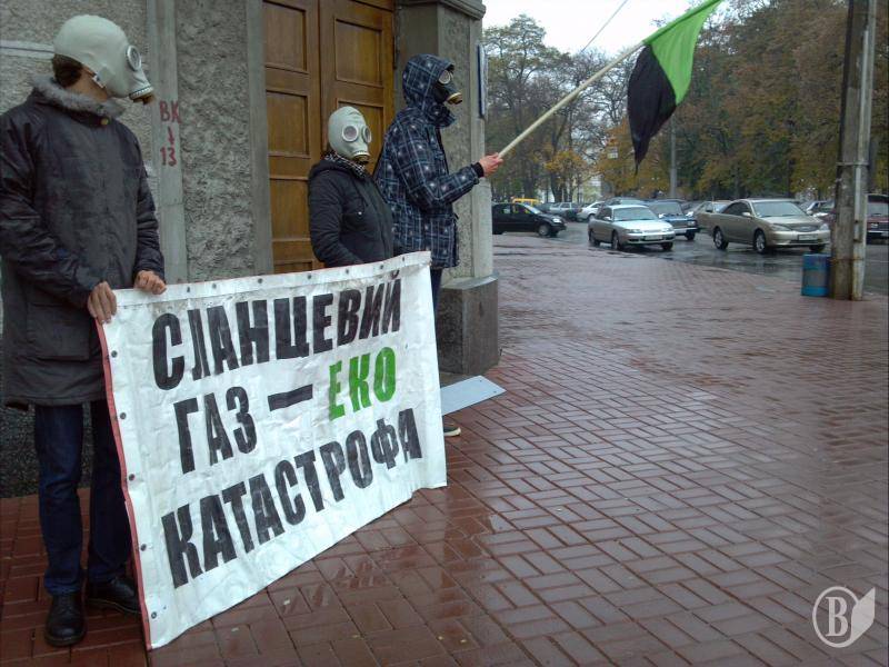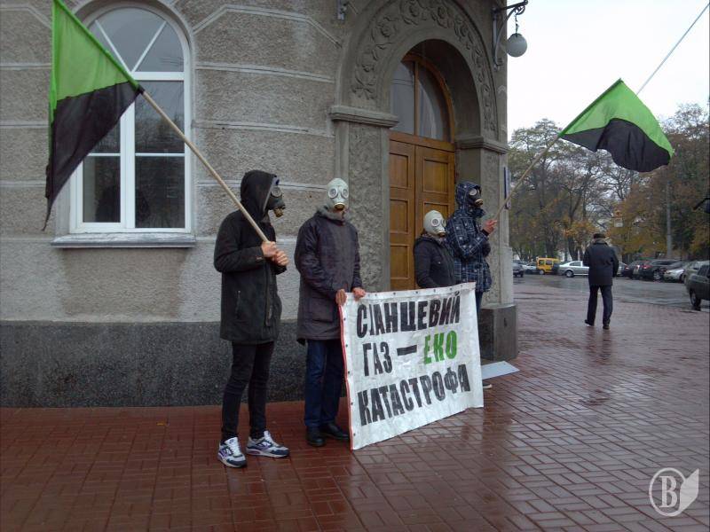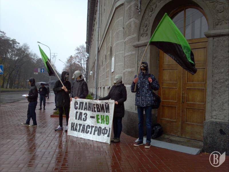Хлопці у протигазах з чорно-зеленими прапорами пікетувала чернігівську облдержадміністрацію з плакатом проти видобування сланцевого газу.