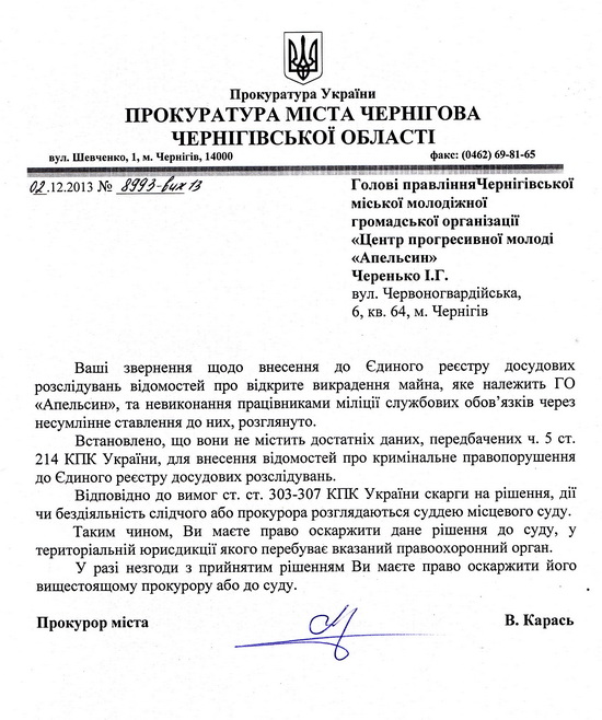 Міськпрокуратурою Чернігова встановлено, що звернення МГО ЦПМ «Апельсин» щодо внесення до Єдиного реєстру досудових розслідувань відомостей про відкрите викрадення майна... не містить достатніх даних.