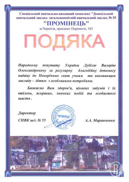 Щирі посмішки та радісні обличчя дітей і дорослих, — це найкраща вдячність за таку роботу. Водночас приємно отримувати і спеціальні грамоти, подяки. Як, наприклад від ДНЗ №55. Адміністрація спеціально-навчально-виховного комплексу «Дошкільний навчальний заклад — загальноосвітній навчальний заклад №55 «Промінець» висловила щиру подяку народному депутату Валерію Дубілю за регулярну благодійну допомогу, надану до новорічних свят учням та вихованцям закладу – дітям з особливими потребами.
