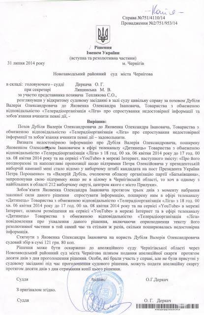 Відповідне рішення ухвалив Новозаводський районний суд міста Чернігова, який розглянув справу за позовом народного депутата Валерія Дубіля до Олександра Яковенка та ТОВ «Телерадіорганізації «Ліга».