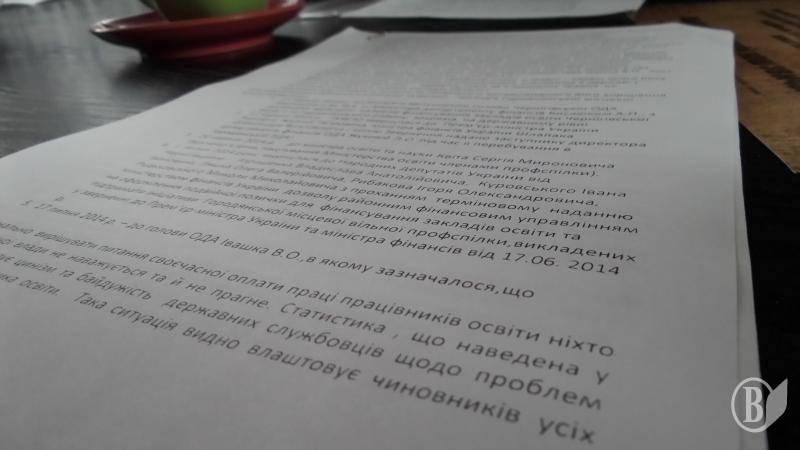 17-го июля учителя обратились к председателю ОГА Владимиру Ивашко с письмом, в котором отмечалось, что «кардинально решать вопрос своевременной оплаты труда работников образования никто из органов исполнительной власти не осмеливается, да и не стремится. Статистика, которая приведена в письмах-ответах, выражает цинизм и безразличие государственных служащих относительно проблем выживания простого рабочего образования. Такая ситуация видно устраивает чиновников всех рангов за годы новейшей украинской истории, при несвоевременном финансировании представляется больше лазеек для коррупционных схем, неоправданного роста кредитных банковских систем, обогащения одних за счет других. . . ».