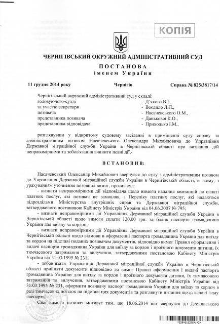 Після чого активіст вирішив довести неправомірність дій управління ДМС України В Чернігівській області у суді і звернувся з відповідною позовною заявою до Чернігівського окружного адміністративного суду. В результаті чого суд підтвердив вартість закордонного паспорту в 170 грн..