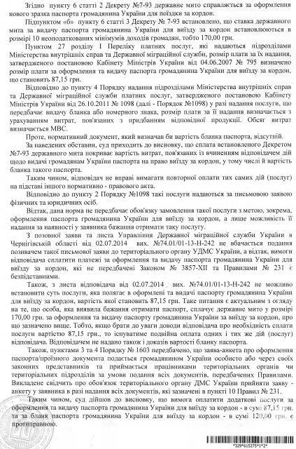 Але працівники управління ДМС в Чернігівській області відмовили йому у видачі закордонного паспорту на підставі поданих документів, вимагаючи доплатити 87,15 грн. за послуги та за бланк паспорту - 120 грн.