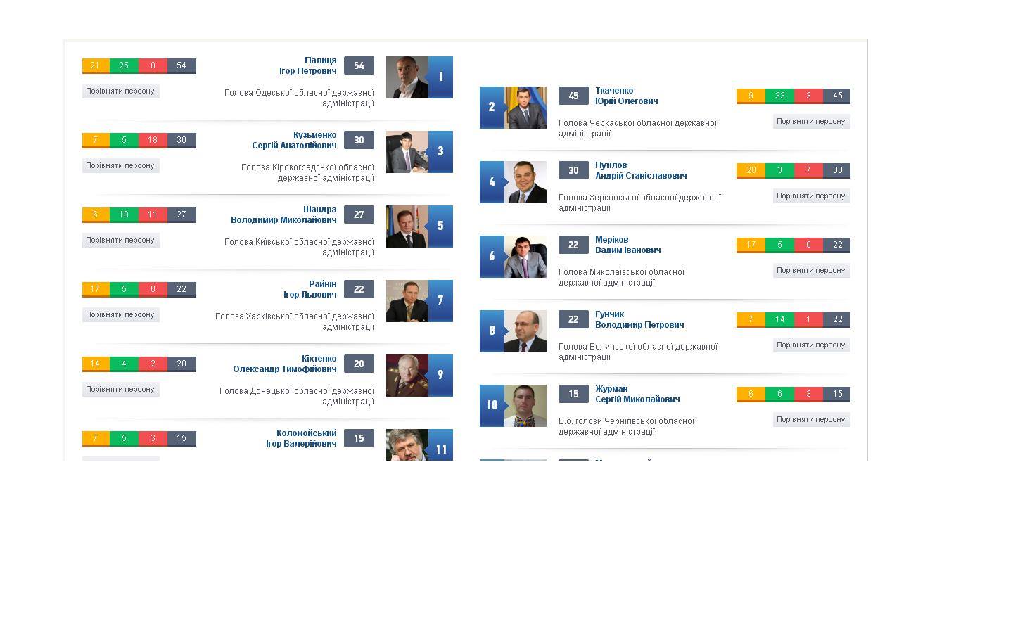 Очолює рейтинг очільник Черкаської облдержадміністрації Юрій Ткаченко, на другому місці – голова Одеської ОДА Ігор Палиця. Третє місце посів голова Волинської облдержадміністрації Володимир Гунчик.