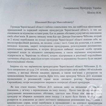 "Самопомич" призывает прийти и поставить свою подпись на открытом письме Генеральному Прокурору Украины Шокину В. М., чтобы он способствовал возобновлению Чибисова Д. О. на должности прокурора Черниговской области.