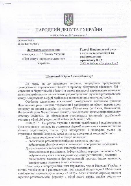 «Ко мне, как к народному депутату, обратились представители общественности Черниговской области, в частности Нежина, по поводу отсутствия местного fm-вещания в области, а также наличия подавляющего вещания, общеукраинскими сетевыми радиостанциями музыкально-развлекательного жанра, с преимуществом в эфире русских и заграничных музыкальных произведений.