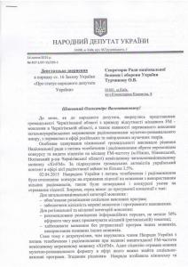 Как отмечается в депутатском обращении, в объявленном Нацсоветом Украины по вопросам телевидения и радиовещания конкурсе на получение лицензии на вещание с использованием свободных радиоканалов, среди условий была рекомендация относительно размещения информационных передач, не менее 50% эфирного времени которых посвящать местной (региональной) тематике. Однако, не ввиду этого, Нацсовет лишил нежинскую и носовскую слушательскую аудиторию возможности слушать информационные передачи местной тематики. И это при том, что в соответствии с «Планом развития национального телерадиоинформационного пространства», утвержденного решением Нацсовета Украины по вопросам телевидения и радиовещания 18. 02. 2015 г. предусмотрено содействие именно развитию регионального и местного вещания.