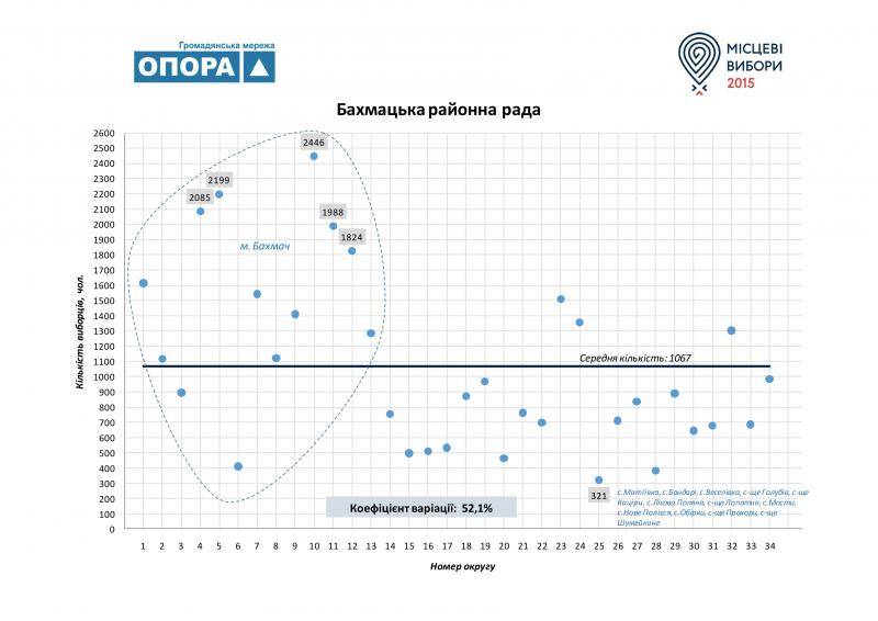 (фото Bakhmach rayon) Бахмацький район. Тут маємо більш-менш рівномірне коливання кількості виборців по округах району довкола середнього значення (1067 осіб). Проте інша ситуація прослідковується у районному центрі, де у трьох округах зафіксовано найбільше відхилення від середньої кількості виборців: округ №4 – 2085 чоловік (+95,4%); №5 – 2199 осіб (у 2 рази); №10 – 2446 (у 2,3 рази). Найменша кількість виборців у 25-му виборчому окрузі з відхиленням від середнього по району ‑70%.