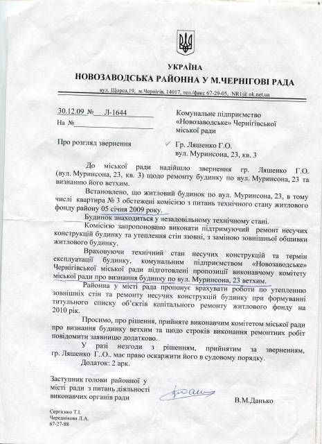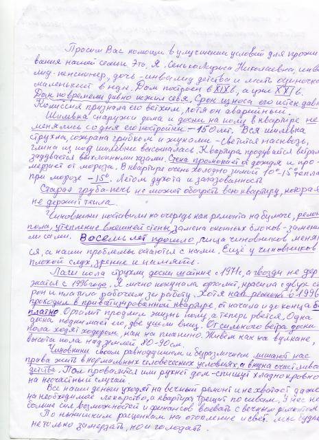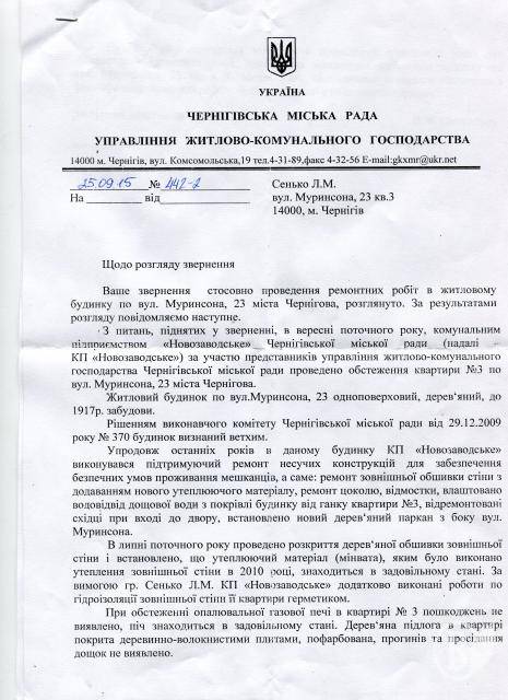 З 1996 року сім’я просить Управління ЖКГ та Чернігівську міську раду все ж таки зробити капітальний ремонт, на який люди мають право за законом. Тому що жити в будинку, в якому цоколь фундаменту з’їдений грибком, стіни промокають від дощів та снігу, підлога ходить ходором, а зовнішня обшивка – взагалі прогнила, просто неможливо.
