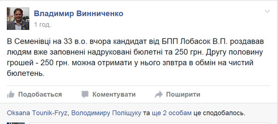 - В Семенівці на 33 в.о. вчора кандидат від *** (провладної сили - ред.) роздавав людям вже заповнені надруковані бюлетні та 250 грн. Другу половину грошей - 250 грн. можна отримати у нього зпвтра в обмін на чистий бюлетень.