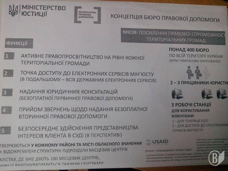 Як пояснив чиновник, в таких бюро кожен зможе отримати безоплатну первинну допомогу(правову інформацію та консультації) і скористатися електронними сервісами Мінюсту. А соціально незахищені громадяни одночасно матимуть доступ і до вторинної допомоги – безкоштовного складання процесуальних документів та представництва у суді.