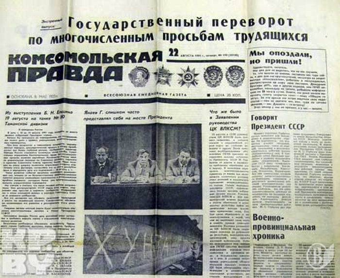 О 6-й ранку 19 серпня 1991-го теле- і радіоканали передали звернення до народу прокомуністичного ДКНС на чолі з віце-президентом Геннадієм Янаєвим, оголосивши про введення надзвичайного стану і переобрання на себе обов’язків глави держави. Таким чином консервативне крило ЦК КПРС намагалося зупинити демократичні перетворення в державі і зберегти СРСР, оскільки на той час Декларації про державний суверенітет вже ухвалили Литва, Латвія, Естонія, Грузія, Вірменія, Молдова, Україна.