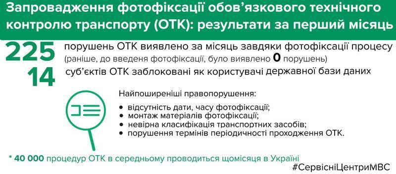 «Вперше в Україні з’явилася реальна статистика проведення перевірок. Лише за місяць контролю фоторезультатів ОТК виявлено 225 порушень проведення технічного контролю транспортних засобів, – повідомив начальник Головного сервісного центру МВС Владислав Криклій. – Зазначу, що раніше у графі порушень статистика показувала нуль. Окрім того, 14-ти суб’єктам було заблоковано доступ користувача до загальнодержавної бази даних. З 451 діючого суб’єкту ОТК, 105 допустили порушення при проведенні ОТК».