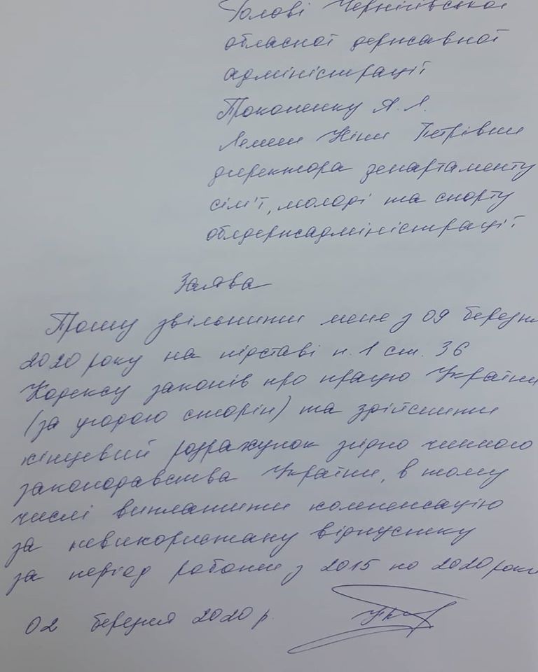 Вчора, 2 березня директор департаменту сім’ї, молоді та спорту Чернігівської ОДА Ніна Лемеш написала заяву на звільнення із займаної посади з 9 березня.