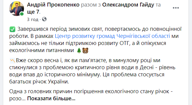 Впевнений, що з підтримкою народних депутатів, ми зможемо покращити екологічний стан річок не тільки Чернігівщини, а й всієї України», - зазначив у дописі Андрій Прокопенко.