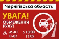 За дорученням Штабу з ліквідації наслідків надзвичайних ситуацій Укравтодору, з метою недопущення накопичення великовагових транспортних засобів та виникнення заторів в дорожньому русі Служба автомобільних доріг у Чернігівській області з 10:00 11 лютого вводить обмеження руху великовагових транспортних засобів в напрямку м. Київ на ділянках доріг