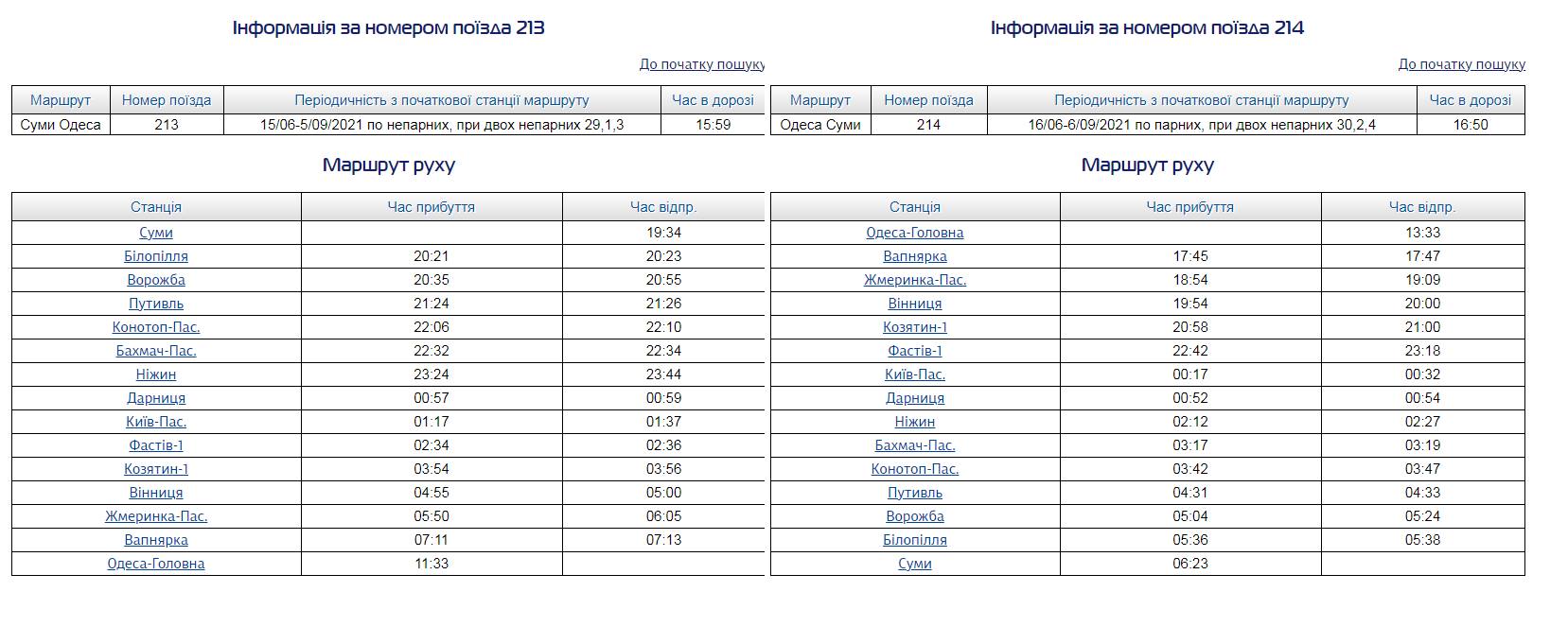 «Зворотньо, з Одеси, із 16 червня по 6 вересня 2021 – по парних. Потяг 213/214 Суми – Одеса (із групою причіпних вагонів 203/204 Чернігів – Одеса, стикування по ст. Ніжин) до ваших послуг. Склад із плацкартних і купейних вагонів. Вартість квитка за маршрутом Суми – Одеса – орієнтовно 600 грн купе, 300 грн – плацкарт, залежно від дня тижня. Із Конотопа – на 70-90 грн дешевше. Квитки у продажу», – йдеться в повідомленні.