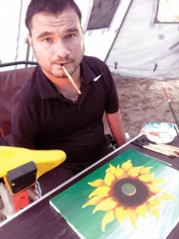 — Люблю життя і світ. Мене надихає сім'я і все, що бачу. От замилувався заходом сонця над полем, і вже хочеться перенести цю красу на полотно, — говорить художник Федір Романов, 31 рік, із села Дослідне Носівського району на Чернігівщині. Має вроджений артрогрипоз — не працюють руки й ноги.