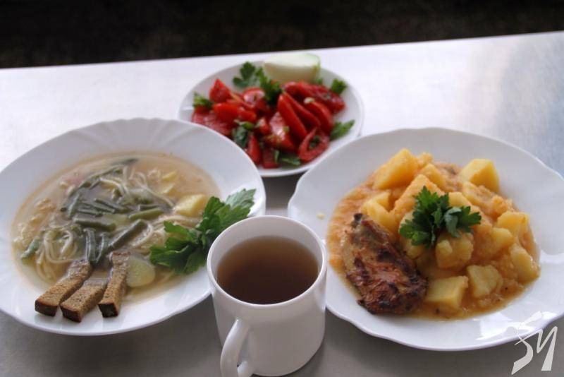 - Відповідно до розкладки продуктів на сьогоднішній день у нас є дві іноземні страви. Це салат “Ачік Чукчук” узбецької кухні, а також суп “Тхукпа” тібецької кухні. У варочному приміщенні ми можемо спостерігати приготування цих страв. Також на другу страву у нас сьогодні картопля по-домашньому і м'ясо-куряче стегно зі спеціями. На сніданок у нас була морква по-корейські з маринованими грибами, - зазначив Вадим Білошин.