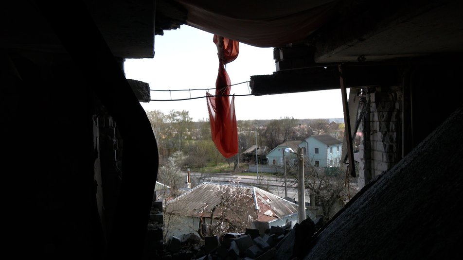 У частині постраждалих квартир цього будинку пробиті наскрізь стіни та повалені перекриття. З перших днів вторгнення цей гуртожиток був на передовій.