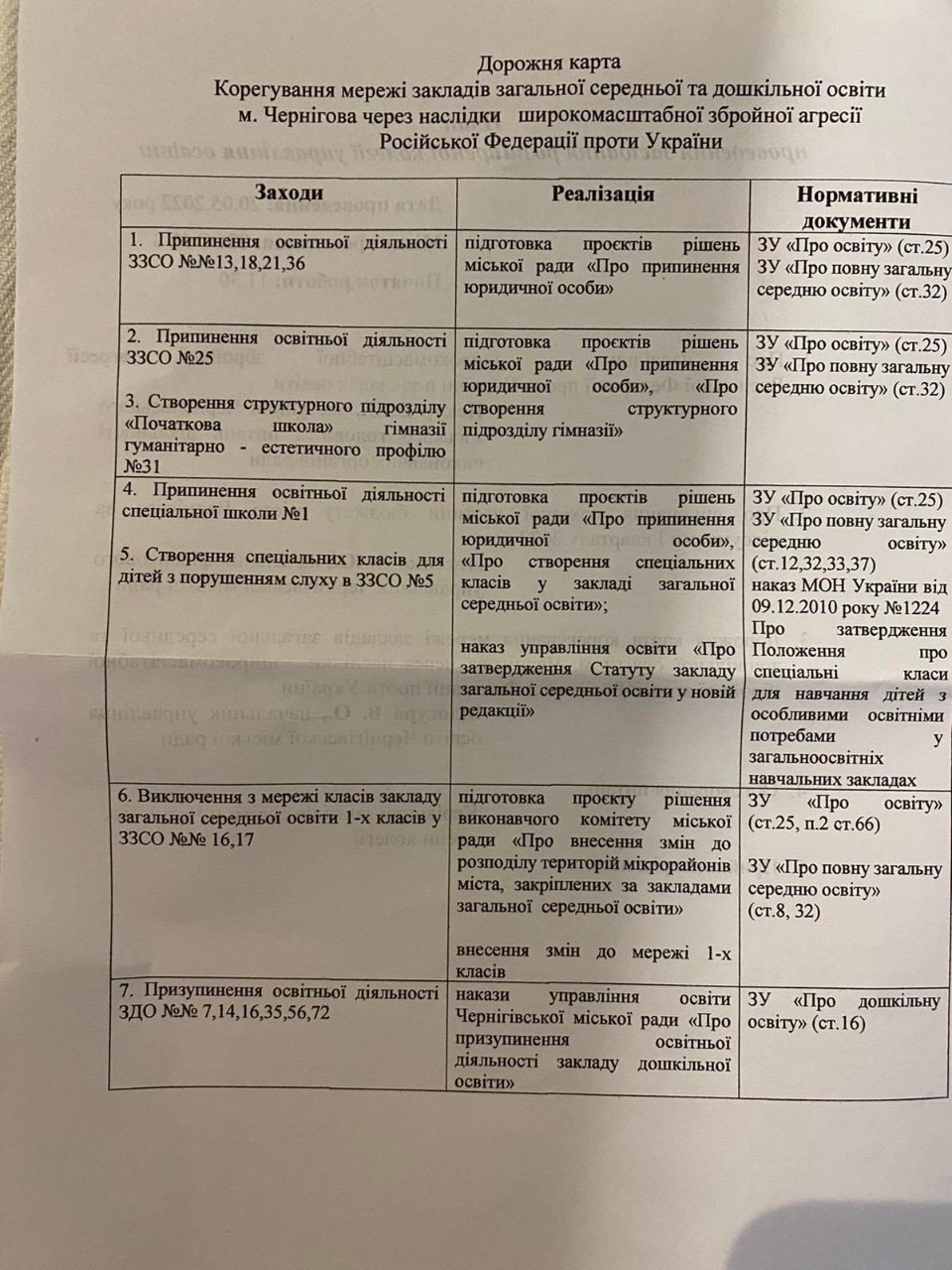 До редакції "Часу Чернігівського" від наших читачів потрапила частина документу, у якому йдеться про закриття шкіл та садочків у Чернігові. Це так звана "Дорожня карта корегування мережі закладів загальної середньої та дошкільної освіти м. Чернігова через наслідки широкомасштабної збройної агресії Російської Федерації проти України".