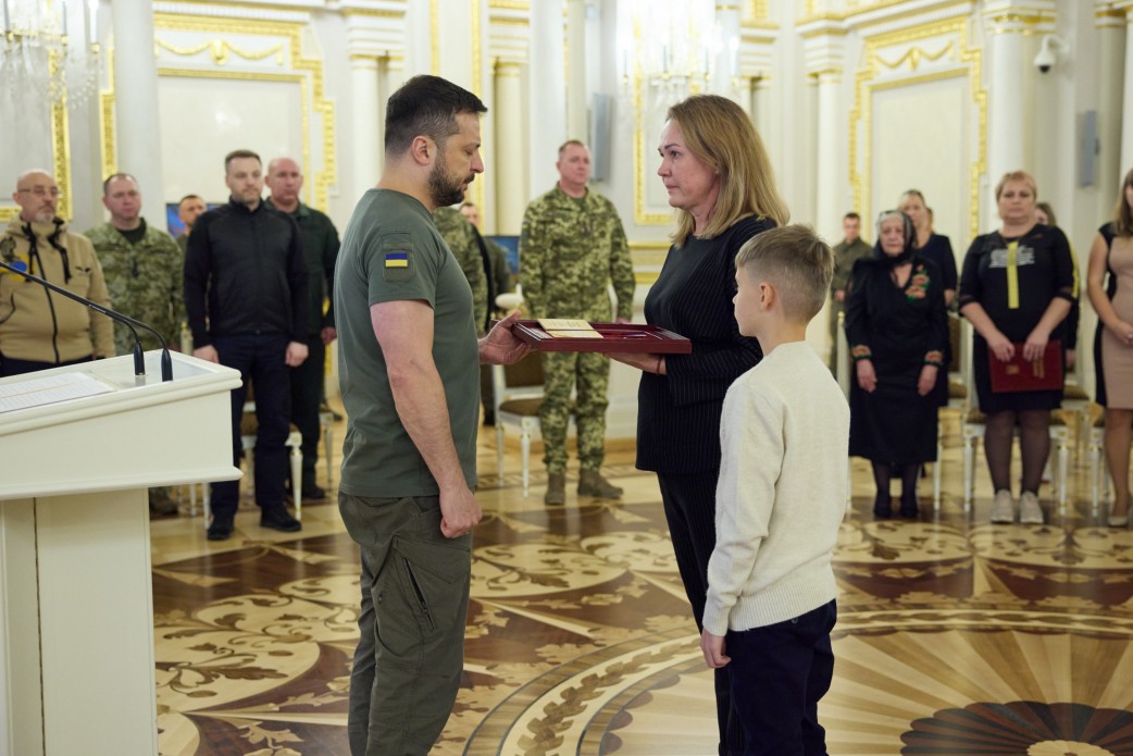 Президент України Володимир Зеленський вручив ордени «Золота Зірка» військовослужбовцям, яким присвоєно звання Героя України, та членам родин загиблих захисників, удостоєних цього звання посмертно.
