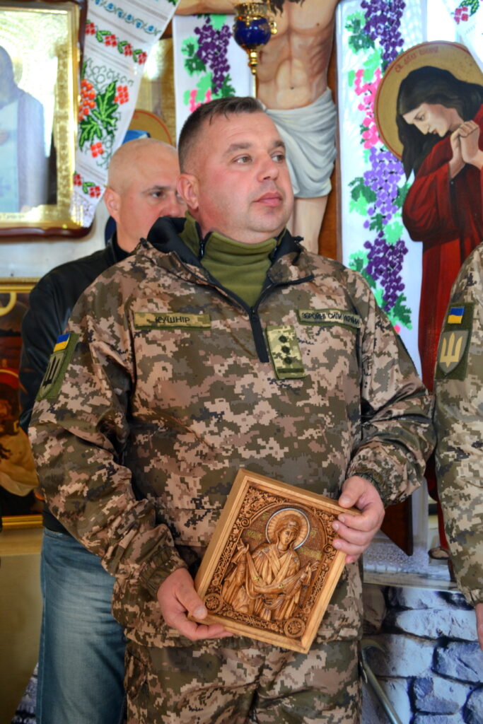 Преосвященніший владика Євстратій вручив настоятелю храму святої Покрови отцю Михаїлу Почесну Грамоту від Чернігівської ОВА. Також дерев’яну ікону ручної роботи нашого ніжинського майстра подарували командиру ніжинської військової частини Миколі Кушніру. Саме він сказав: «Ніжин не здамо росіянам». І наші воїни захистили Ніжин, не дали росіянам зайти у місто. І в День Захисника України весь храм співав Миколі Кушніру многая і благая літа.