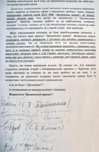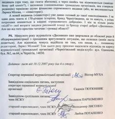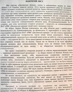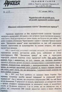 P.S. В прошлом году журналисты «Деснянки» уже обращались в областной совет и облгосадминистрацию с просьбой урегулировать ситуацию, которая сложилась (копия письма добавляется). Но ответ почему-то поступил не тем, кто писал, а. . . главному редактору, Ларисе Миловий!