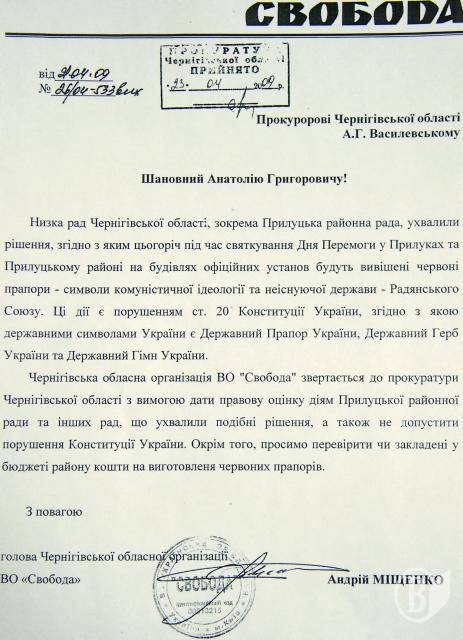 Черниговская областная организация ВО Свобода 23 апреля обратилась к прокурору Черниговской области с требованием дать правовую оценку действиям Прилуцкого районного совета.