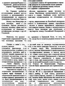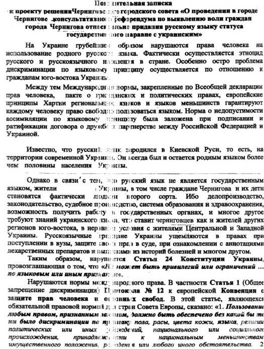 Автори проекту рішення заявляють, що сьогодні в Україні "здійснюється політика етноциду російського та російськомовного населення", оскільки в Україні російська мова не є державною і громадяни України і Чернігова зокрема стають людьми другого сорту – переконані представники названих фракцій.