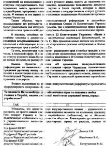 Так, пояснювальна записка до проекту рішення щодо референдуму написана російською мовою. Очевидно, це було зроблено для посилення інформаційного навантаження пояснень та ілюстрації очікуваного російськомовного майбутнього.