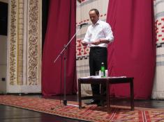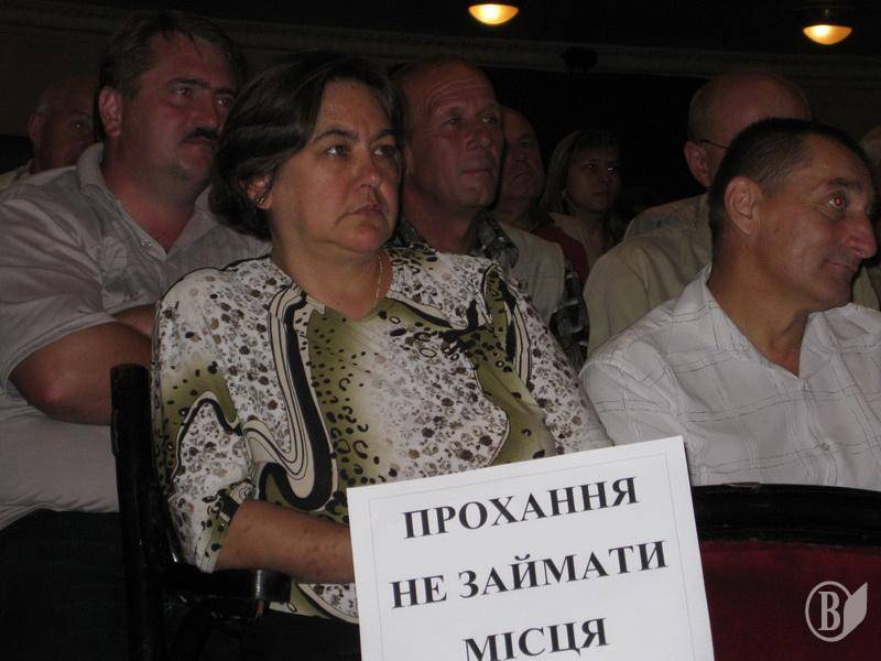 В 11 часов в помещении театра им. Т. Г. Шевченко жители города могли пообщаться и задать свои вопросы кандидату. Зал был полон. Большинство собравшихся - в возрасте от 30 до 60 лет.