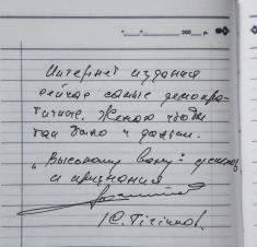 Але на зустрічі мене ще насторожили захоплення Тігіпка Китайською економікою. Якщо він хоче, щоб ми розвивались за китайськими принципами - то я проти. Китай розвивався за рахунок двох речей: дешевої масової робочої сили і крадіжці технологій. Це тупиковий шлях: уже зараз рівень споживання в Китаї різко росте (тобто збільшується рівень доходів) і захоплення ринку за рахунок дешевих товарів на вкрадених технологіях не може іти постійно. Якщо у вартості товару не буде закладена наукова складова, то у вартості наступного товару буде закладена і наукова складова і складова її захисту. На жаль, Тігіпко жодного слова не сказав про розвиток індії. Йому, як українському бізнесмену зрозуміліша логіка найму дешевої робочої сили, ніж інвестування в розвиток трудових ресурсів (в освіту). І чисто людський аспект нещирості: записка написана російською, а прізвище українською.