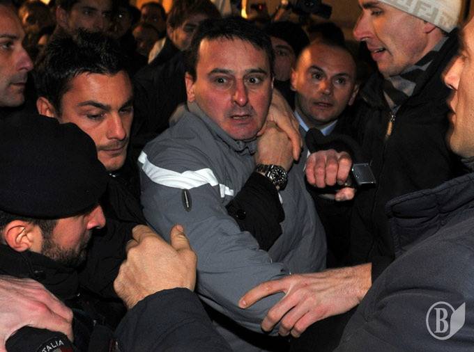 Итальянский премьер получил удар в лицо и упал на землю. В телекадрах было видно, как у господина Берлускони идет изо рта кровь. Он упал на землю и поднялся с помощью его помощников.