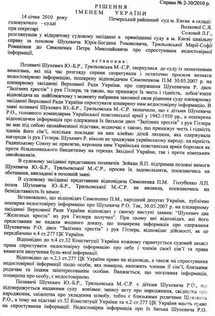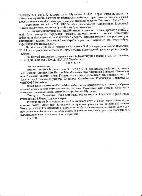 Суд решил: «Обязать Симоненко Петра Николаевича на ближайшем с момента вступления в законную силу решения суда пленарном заседании Верховной Рады Украины опровергнуть распространенную им недостоверную информацию о Романе Шухевиче».