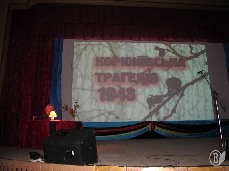 Під час зустрічі у районному Будинку культури члени Української спілки в’язнів – жертв нацизму спілкувалися з вцілілими свідками Корюківської трагедії. Діна Степанівна Корнієвська, Галина Михайлівна Попова та Ганна Андріївна Тихоновська поділилися моторошними спогадами про холоднокровне вбивство карателями всього населення, знищення Корюківки та обставинами свого порятунку.