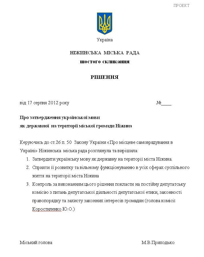 За його словами, прийнятий Верховною Радою незаконний законопроект не може бути підставою для узаконення в Ніжині будь-якої "регіональної" мови окрім державної української.