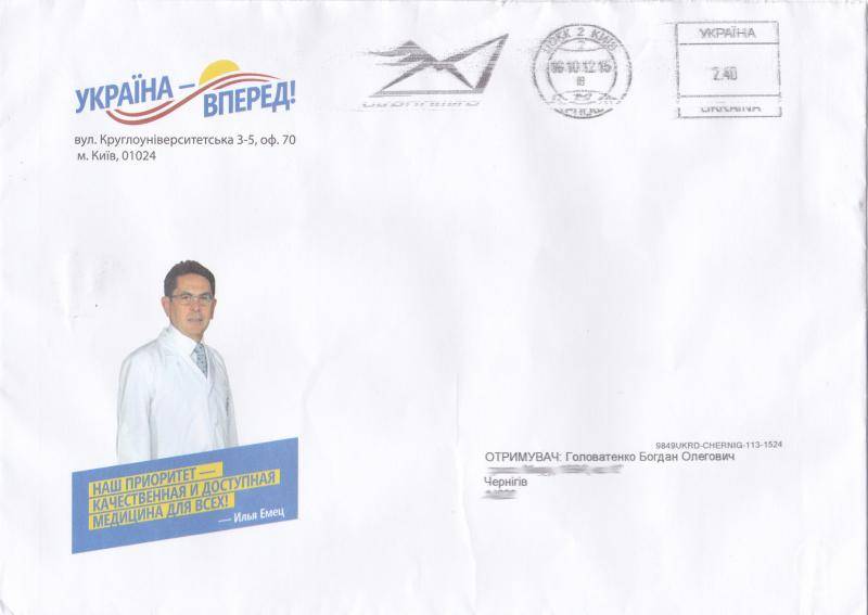 Зворотня адреса на поштовому конверті - партійний офіс "Україна - вперед!": м. Київ, вул. Круглоуніверситетська 3-5, оф. 70.
