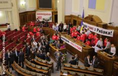На трибуні розміщено плакати "Рада гниє з Рибака" і "Кнопкодави – геть із Ради".