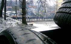 Чорні, закіптюжені колишні білі колонади стадіону імені Лобановського, чорні стіни будинків і чорна розібрана бруківка. Усе це від клубів диму від автомобільних шин, що палали тут не так давно.
