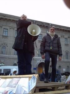 Мітингуючі закликають приносити медакаменти і марлеві пов"язки для потреб Майдану у Києві. Виступаючі говорятть про те, що в камуфляжі на Київ не пропускають.