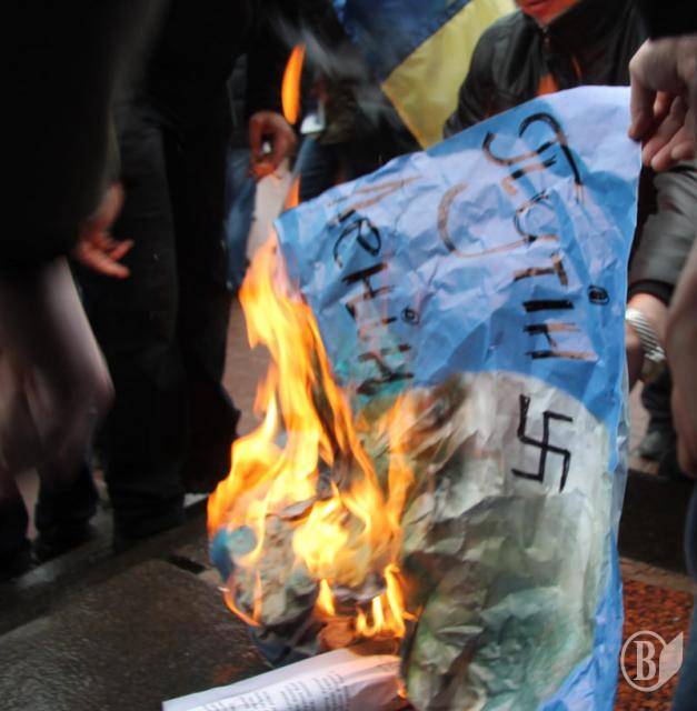 Після закінчення мітингу чернігівці почали палити портрет Путіна на сходах театру.
