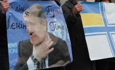 Плакати і портрети президента Росії Володимира Путіна були широко представлені на мітингу у Чернігові, на якому були присутні близько 5 тисяч чернігівців.