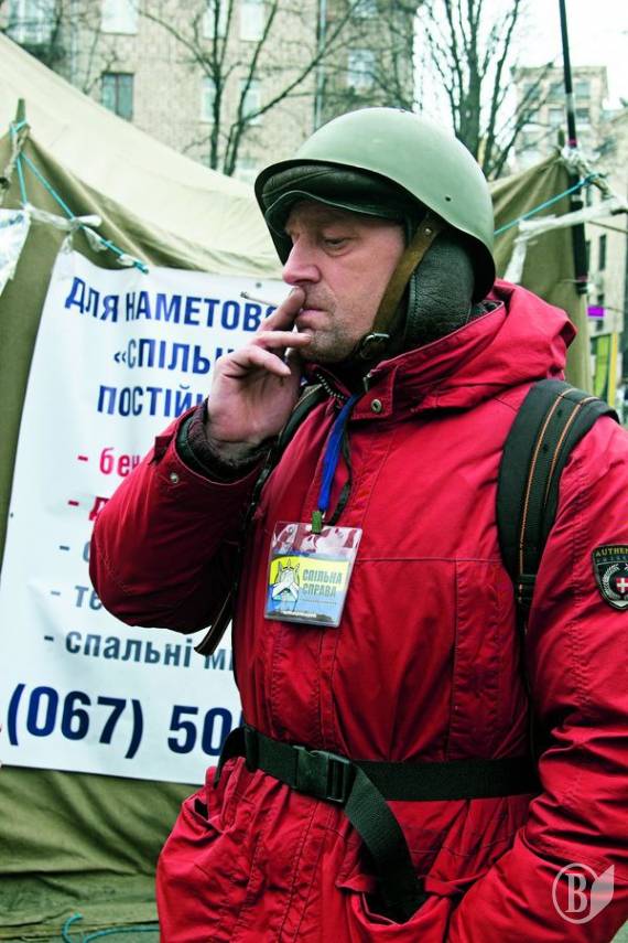 Носить каску, куплену на місцевому базарі за 60 гривень. Після 18 лютого возить у рюкзаку сокиру.