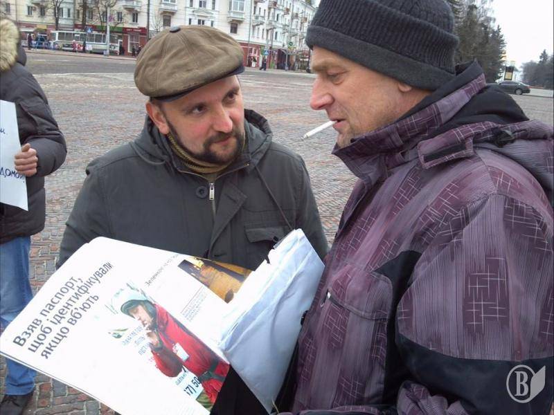 Струмінь кисню відкидає пляшку метрів на 50 – значно далі, ніж вручну. Люди кричали, що треба сипати мелений перець у вогонь. Вітер якраз дув у бік "беркутят", пік їм очі. Коли стоїш 2 години, рука мліє. Курити хочеться. Просиш: чоловіче добрий, підкури цигарку і дай цмокнути. Цигарка іде по колу і вже не вертається. Коли мене підмінили – кидав каміння. Пляшки – ні, бо рука вивихнута. Був би кулемет, стріляв би без церемоній. Біля чернігівського намету зустрів однокурсника, якого не бачив 30 років. Вернулися вдвох, а стела вже не наша.