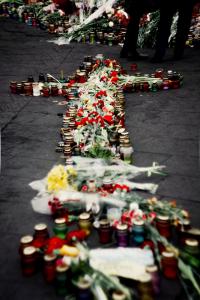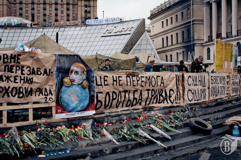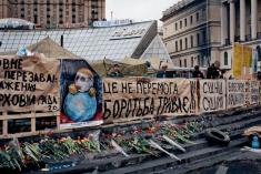 На сцені Майдану лунає молитва, усюди квіти та свічки,таке відчуття,що відбуваються великі похорони.