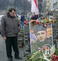 На улице Грушевского, около баррикад рядом со стадионом «Динамо», была особенно волнующая остановка. Ведь именно здесь погиб белорус, земляк наших гостей Михаил Жизневский, родом из Гомельщины. На улице, где он погиб, установлен импровизированный памятник Михаилу, его большой пертрет, над ним белорусский национальный бело-красно-белый флаг, рядом живые цветы, горят свечи. Гости поклонились своему земляку, который стал одним из первых погибших в нашу революцию.