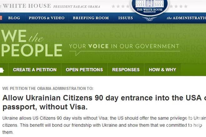 На официальном сайте Белого дома размещена петиция, согласно которой предлагает введение безвизового режима между США и Украиной на срок в 90 дней.
