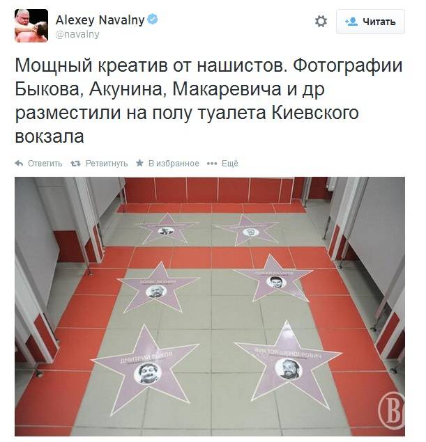 "Потужний креатив від нашистів. Фотографії Бикова, Акуніна, Макаревича та інших розмістили на підлозі туалету Київського вокзалу", – зазначив він.