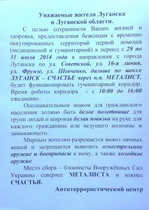 ...(медичної та гуманітарної) створено гуманітарний коридор з міста Луганськ та організовано там відповідну роботу за напрямком по вул. Радянській, вул. 16-та лінія, вул. Фрунзе, вул. Шевченка, далі по шосе Луганськ–Щастя через населений пункт Металіст.